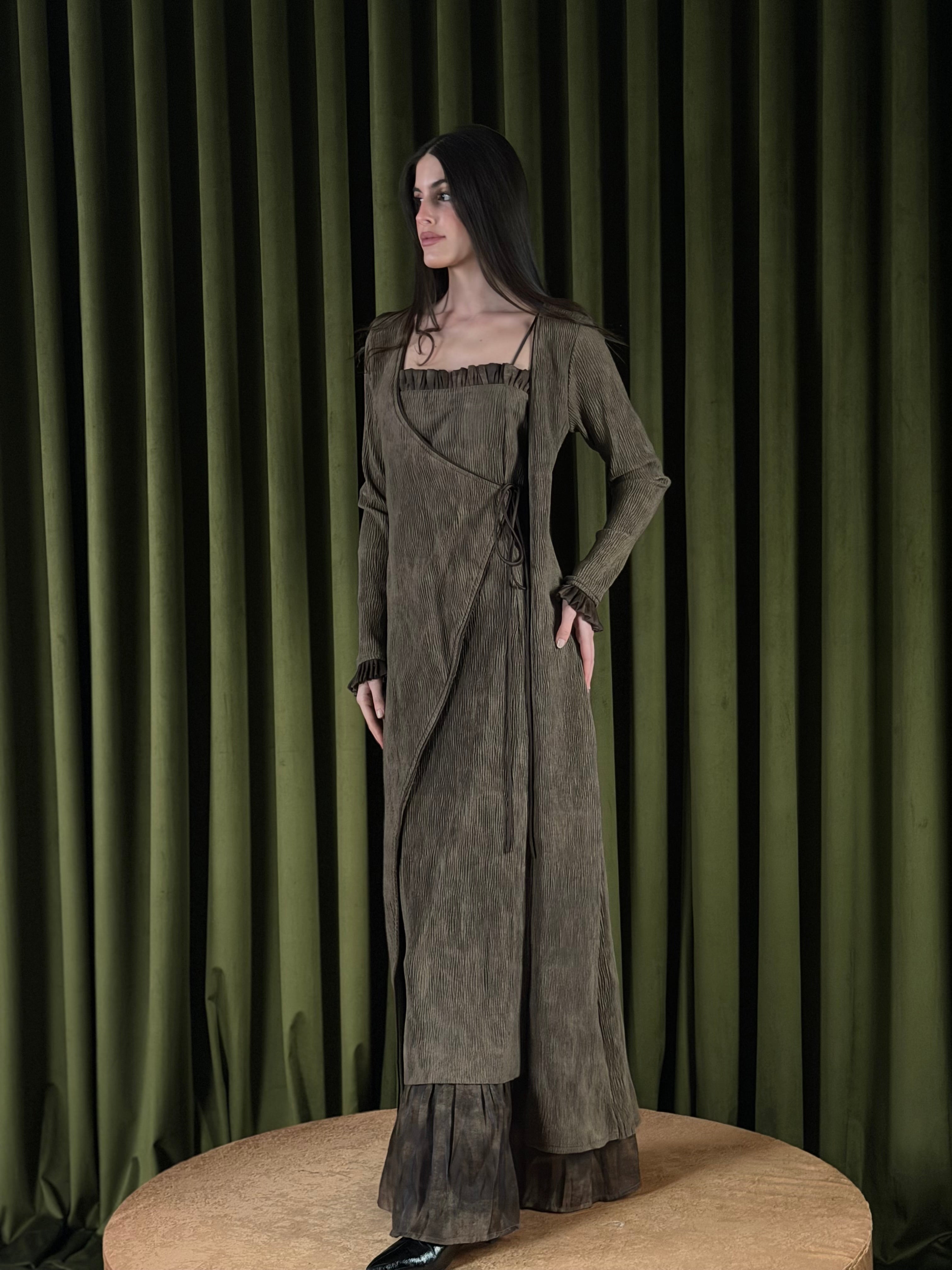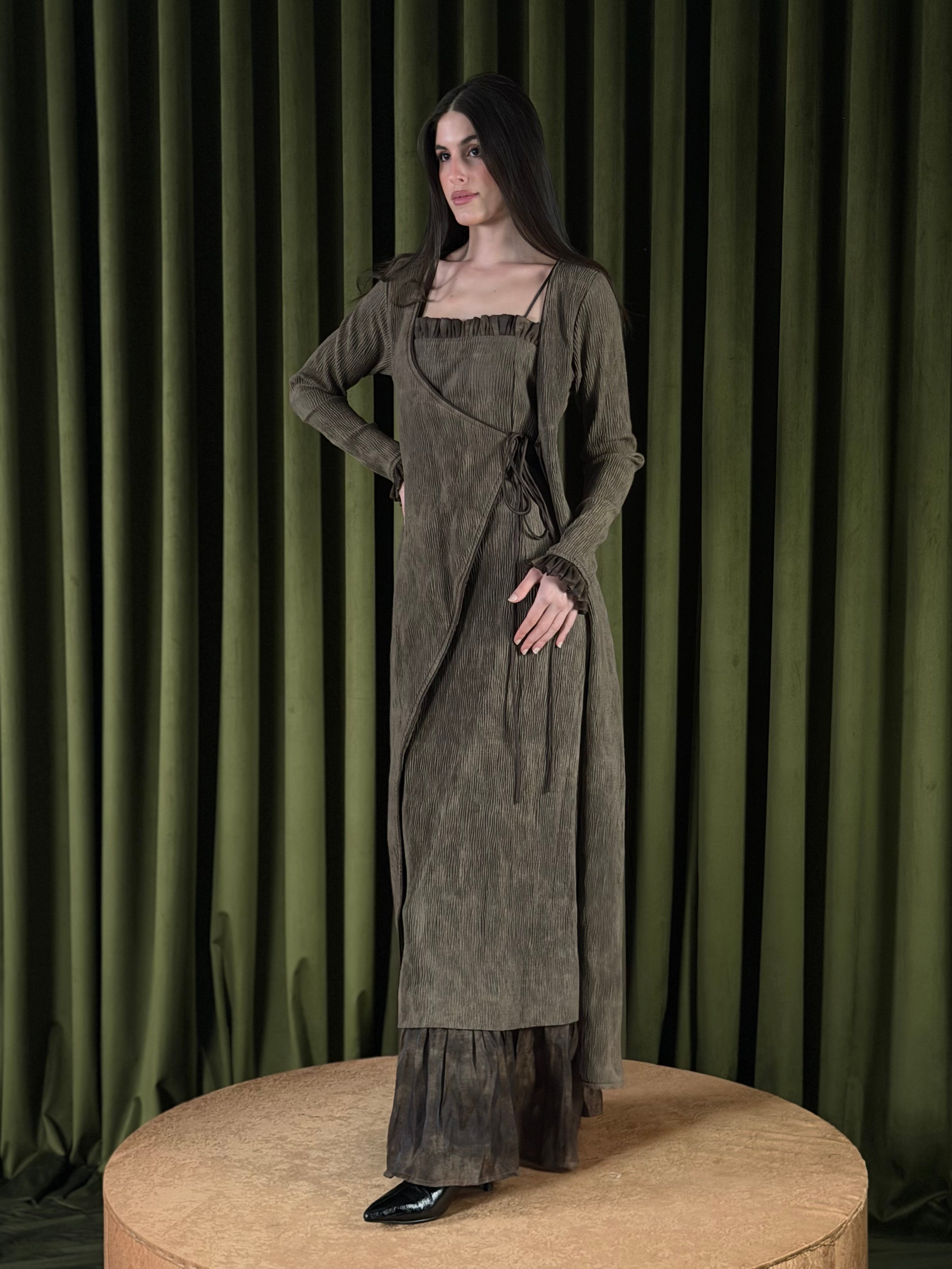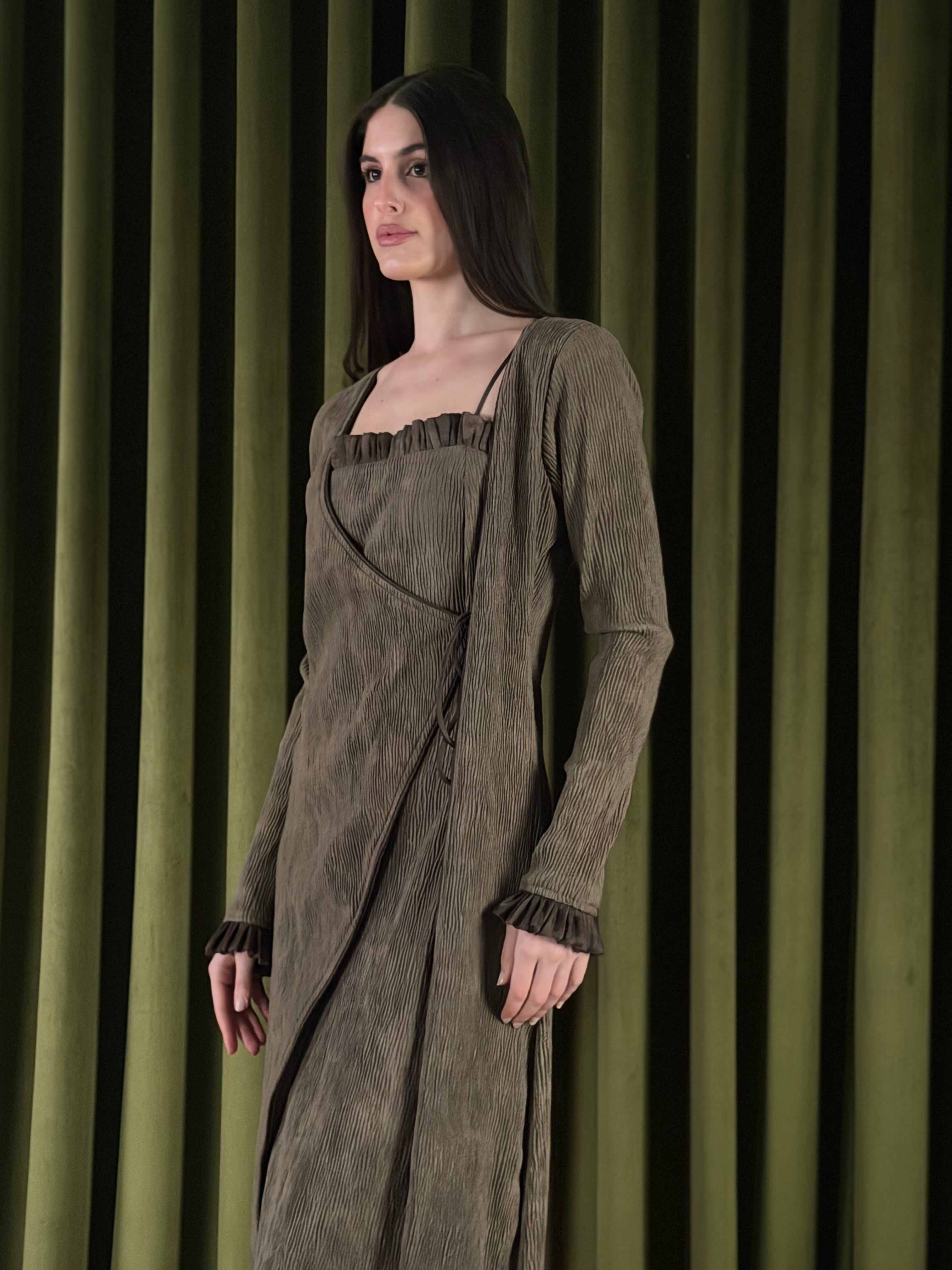 A two-piece set - textured dress layered with a matching wrap cardigan. The dress is designed with a subtle ruffled neckline and a relaxed silhouette that falls effortlessly to the hem. The wrap cardigan has an asymmetric front with adjustable side ties, softly defining the waist. Finished with long sleeves, ruffled cuffs, and a sheer layered hem, this set blends comfort with elegance.