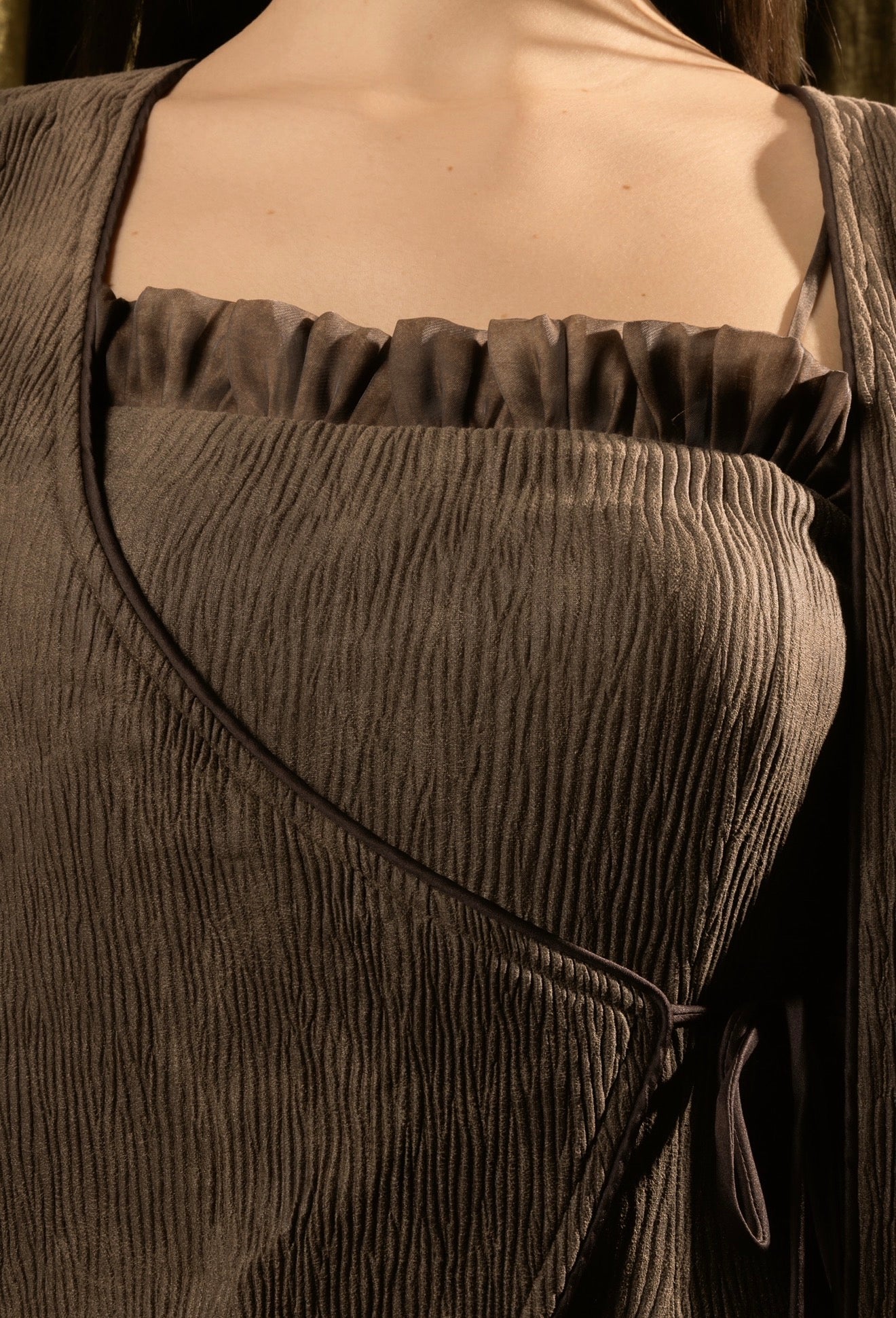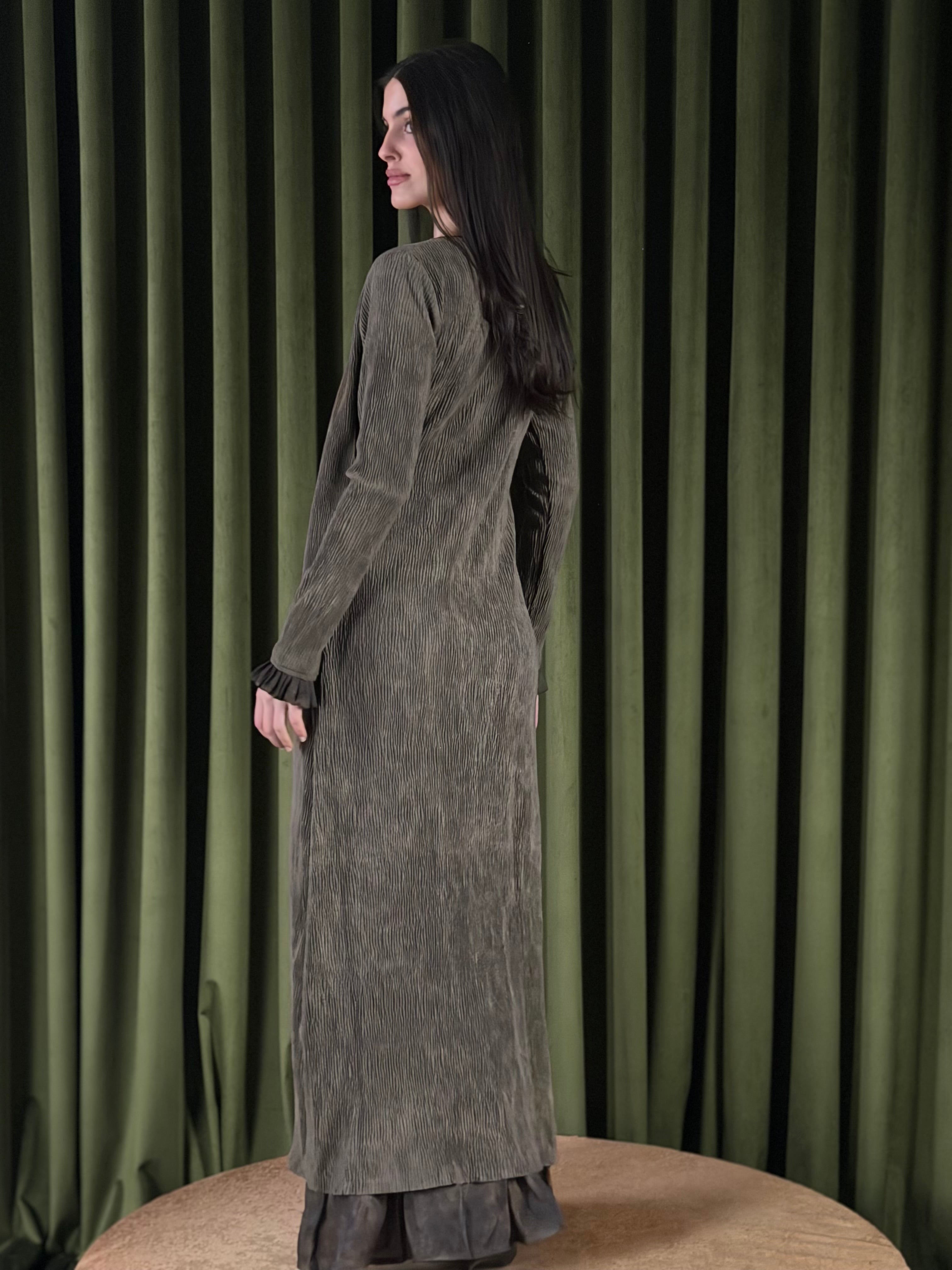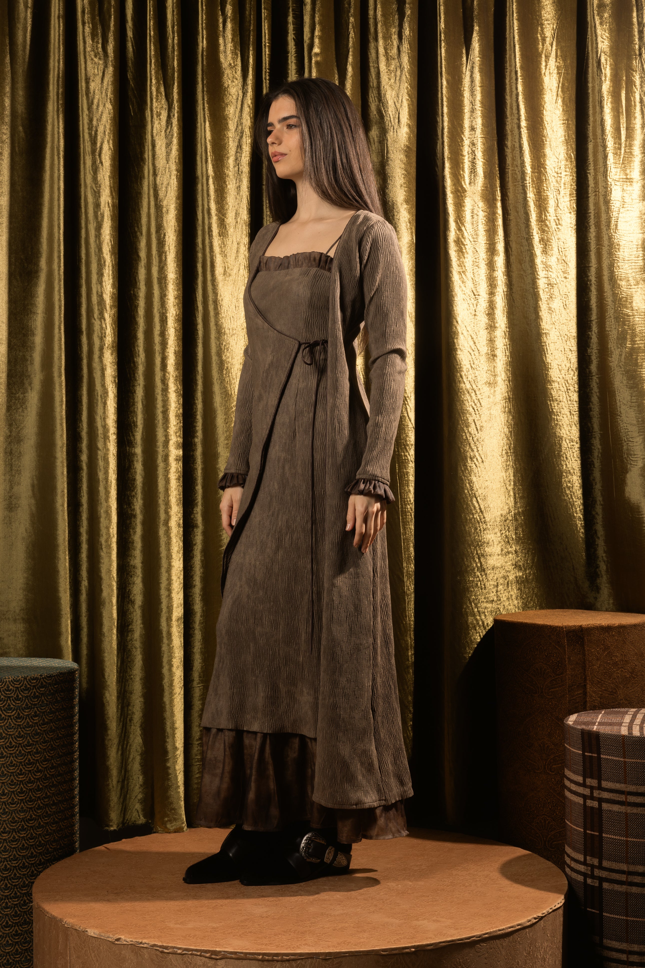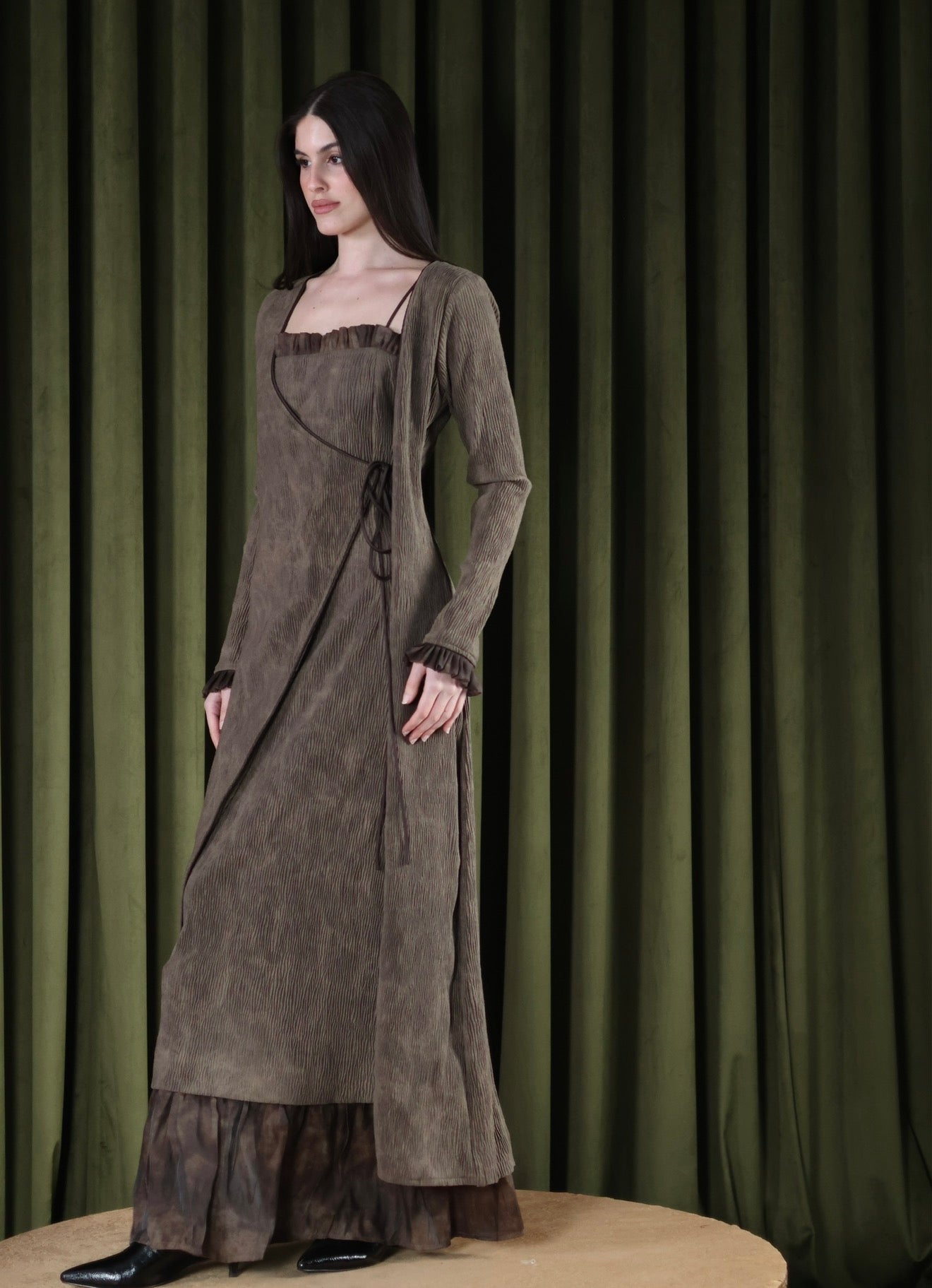 A two-piece set - textured dress layered with a matching wrap cardigan. The dress is designed with a subtle ruffled neckline and a relaxed silhouette that falls effortlessly to the hem. The wrap cardigan has an asymmetric front with adjustable side ties, softly defining the waist. Finished with long sleeves, ruffled cuffs, and a sheer layered hem, this set blends comfort with elegance.