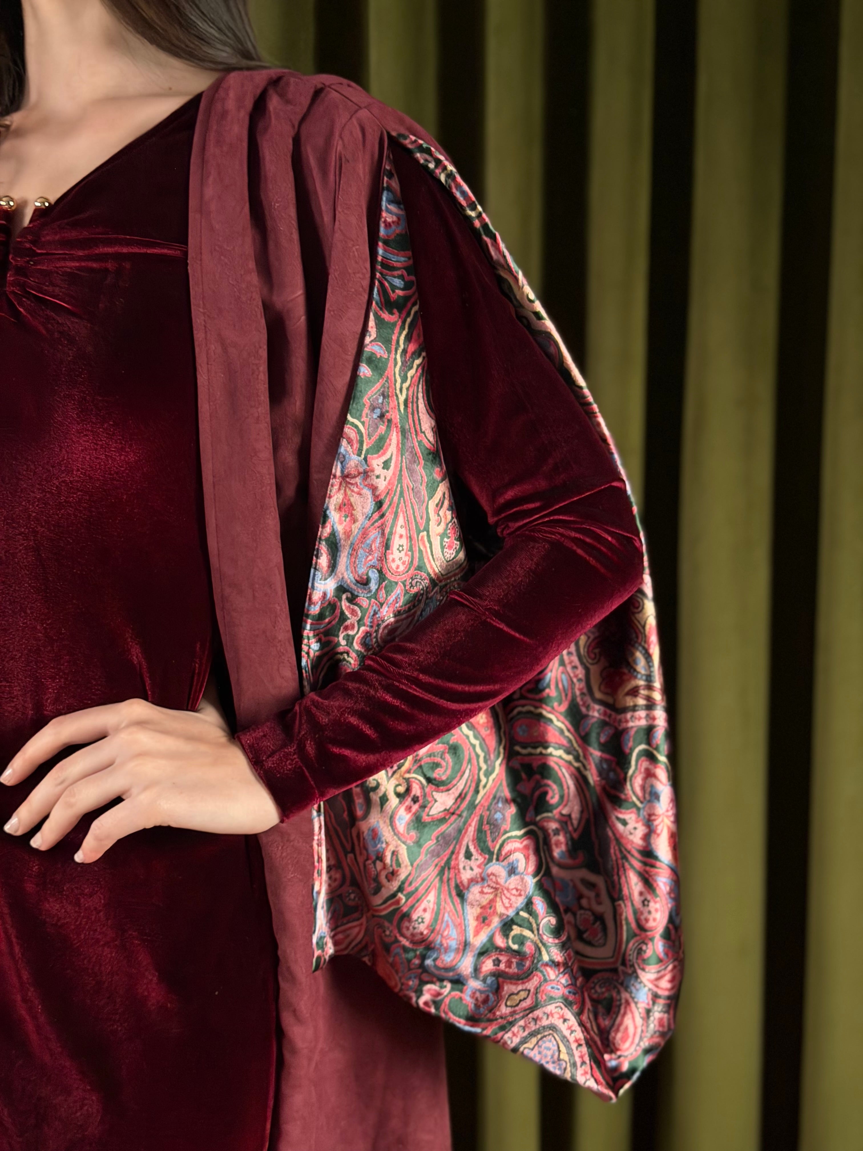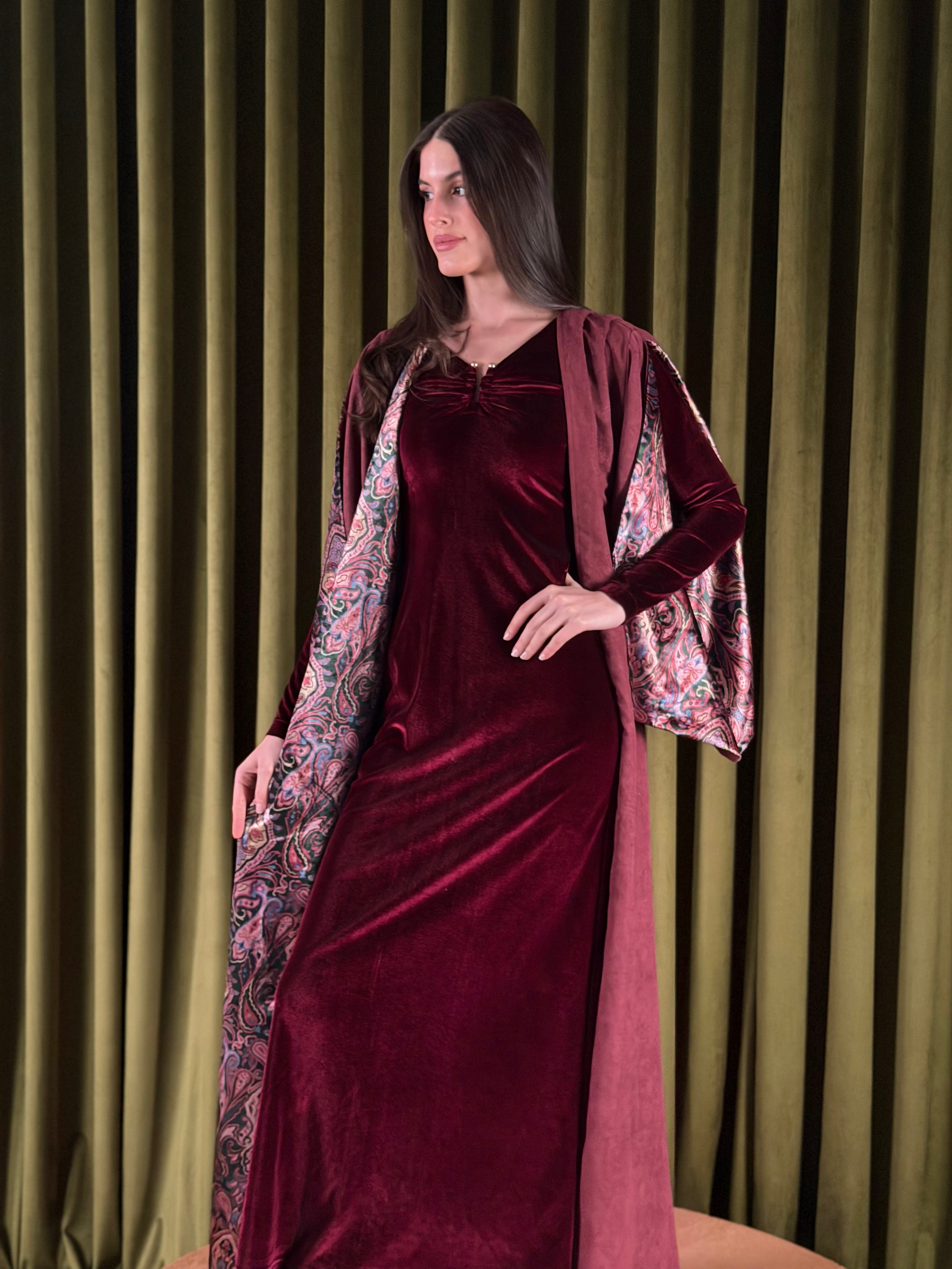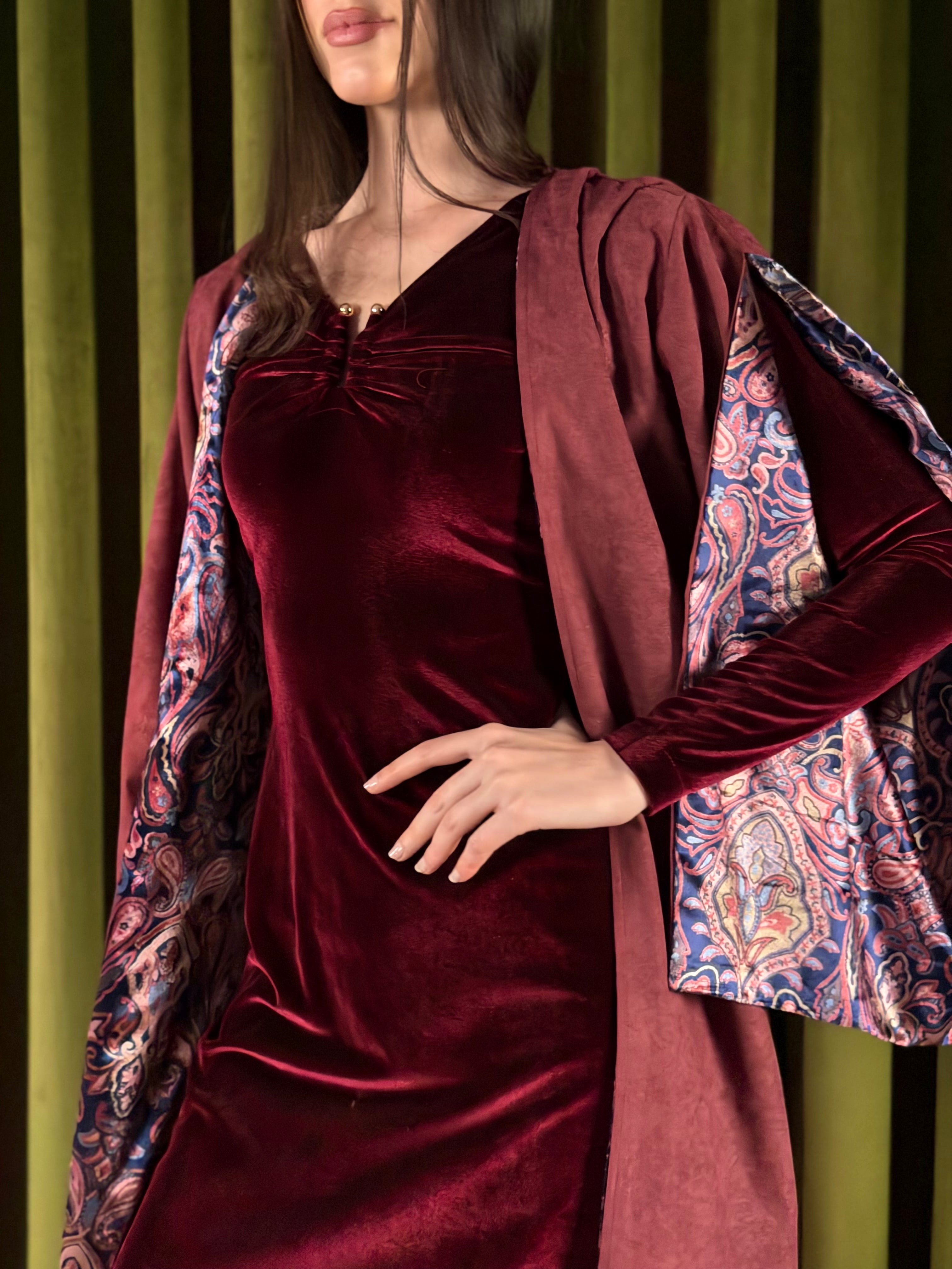 Two-piece set - a velvet inner dress paired with a flowy lightweight suede bisht. The inner dress is a soft amd stretchy maroon velvet, with a subtle gathering at the neckline with a golden metal detail for a flattering finish. Layered over it is a lightweight suede outer piece, detailed with delicate embossed patterns and finished with a printed velvet lining that reveals itself with movement. Designed with relaxed and open sleeves, to reveal the velvet prints.