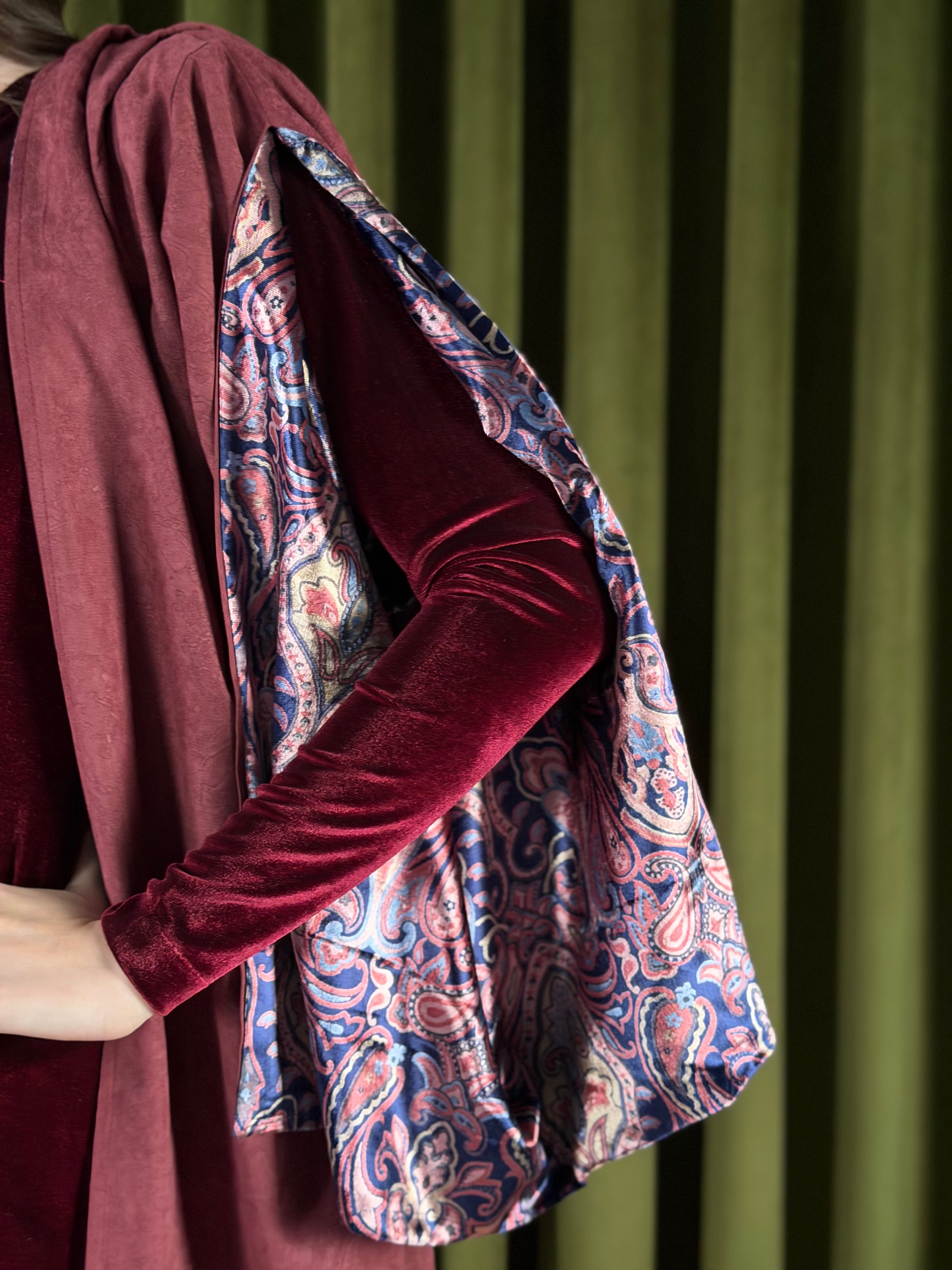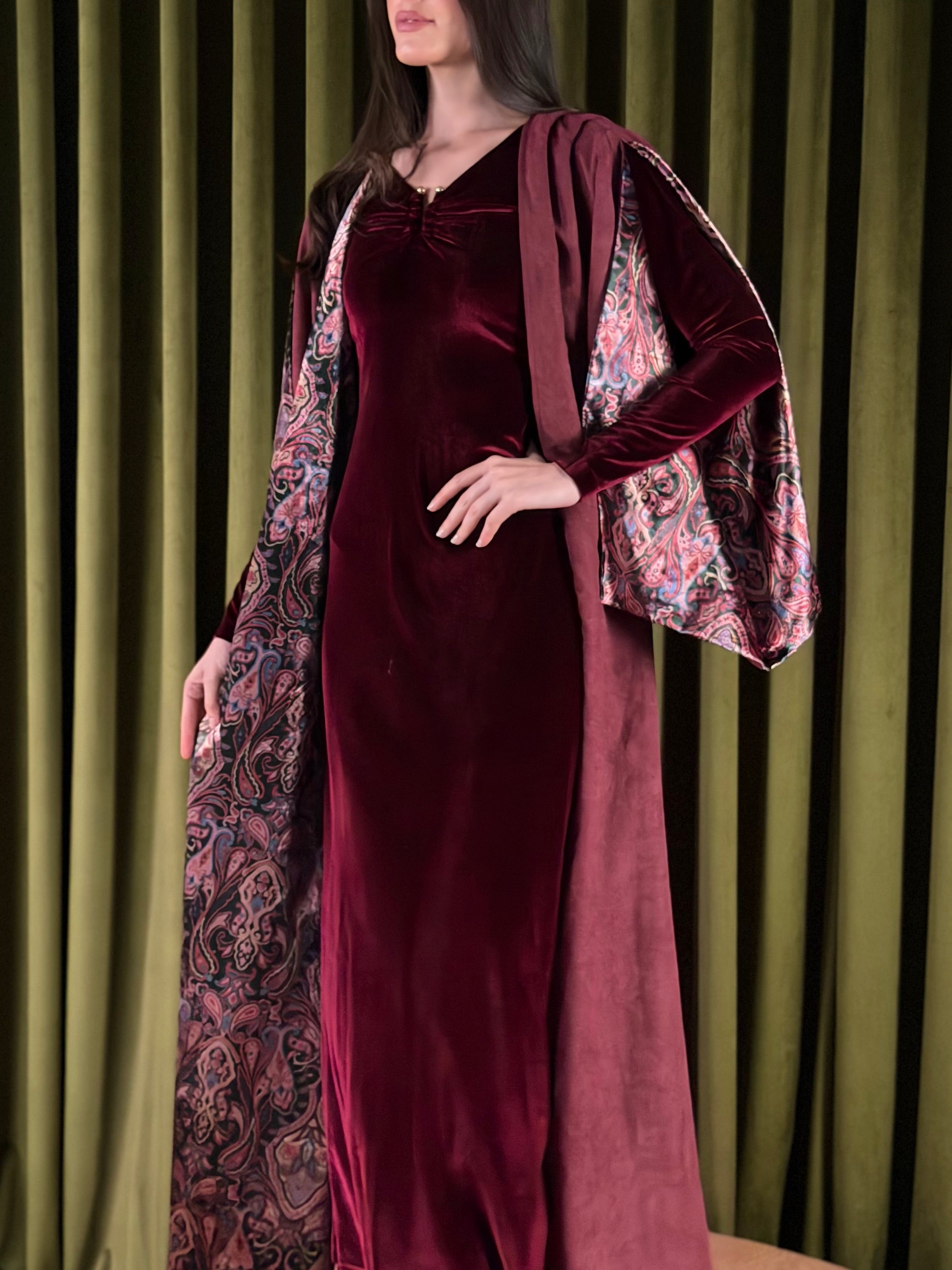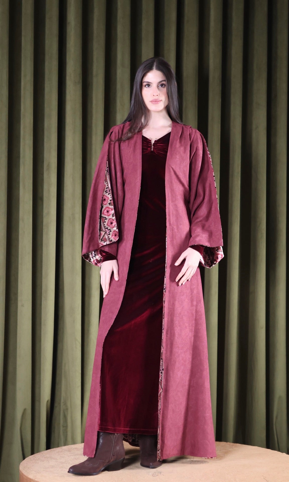 Two-piece set - a velvet inner dress paired with a flowy lightweight suede bisht. The inner dress is a soft amd stretchy maroon velvet, with a subtle gathering at the neckline with a golden metal detail for a flattering finish. Layered over it is a lightweight suede outer piece, detailed with delicate embossed patterns and finished with a printed velvet lining that reveals itself with movement. Designed with relaxed and open sleeves, to reveal the velvet prints.